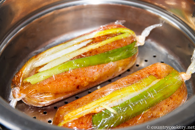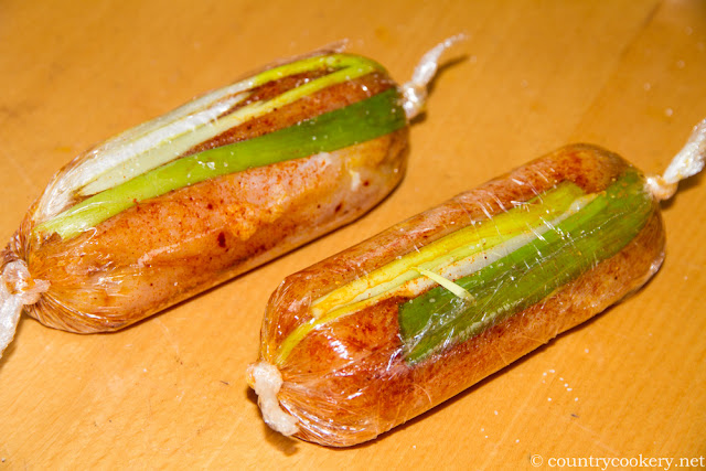 - Put the two halves together, place on a a piece of cling wrap and give some of the shallots on top. Wrap the cling wrap nice and tide together with knots on both ends.