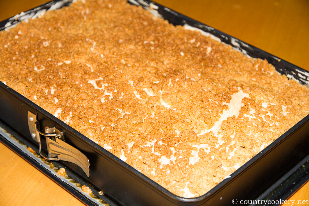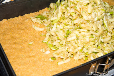 Take the pastry out of the freezer, grade the half of it onto baking tray (don’t forget the baking paper). Distribute the apples on top, then the egg-whites. Now grate the remaining pastry on top. Put into the hot oven on 180 degrees Celsius until ready (dark-gold colour).