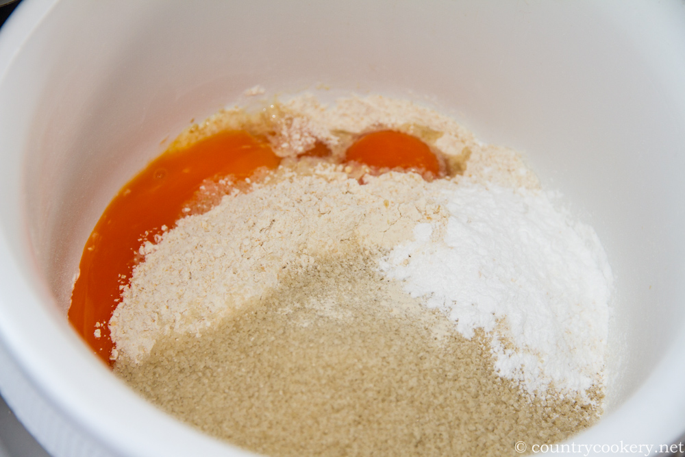 Now mix the egg-whites, add 150g raw sugar and some vanilla wile mixing. Then add 1 table spoon of potato flour or corn flour and give it a quick but gentle mix to combine.